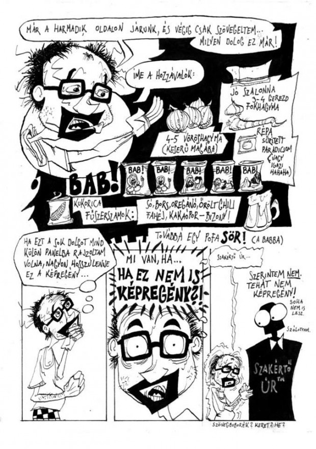 Lakatos István A Bab! című képregényében nagyon tetszett az irónia, amellyel a szerző saját sértettségét fogalmazta meg és egyben igyekezett is orvosolni; bár félő, hogy egy nagyon szűk körön kívül az olvasók a képregény eme rétegét egyáltalán nem tudják értelmezni (kérdés persze, hogy egy nagyon szűk körön kívül ki vesz ma Magyarországon szerzői képregényeket). Sodró lendületet ad a főzésnek és az önnarrációnak a formai sokszínűség: változó panelméretek, változó panelszámok, túl sok szöveg, túl kevés szöveg. Az egész miniképregény elmenne főzés nélkül is, bár azért többek között a „(keserű magába)” kiszólás miatt én nagyon örülök, hogy a szerző végül mégsem hagyta el képes lírai monológjából a főzés motívumát. Részemről ezt a képregényt az év végi tantestületi osztályozó értekezleten olvastam (titokban) és dőltem a röhögéstől (szintén titokban), ugyanakkor amikor szenvedő sorstársaimnak elsuttogtam (titokban), hogy min derülök (titokban), elég furcsán néztek rám (nyíltan).