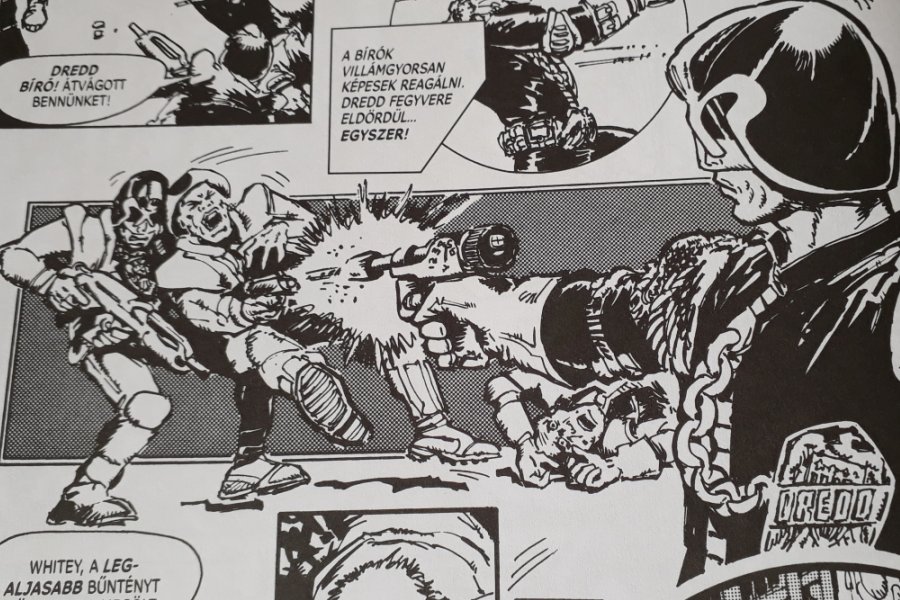 És a történet! Úgy lövi fejbe a szerencsétlen, alig bűnös mitugrászt Dredd bíró, hogy megijedek tőle. És azonnal akarok még belőle.