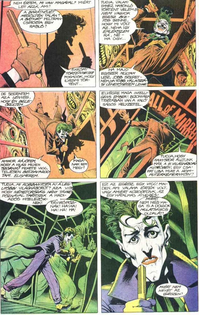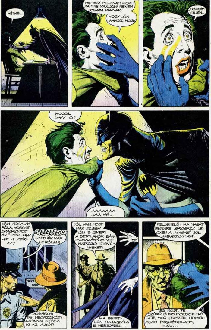 És Batman? Hogy illik ő a képbe? Mint már korábban említettem, ők ketten egymás ellentétpárjai, ami meglehetősen általános jelenség a képregények világában. Az őrjöngő Hulk ellenfele az emberfeletti intelligenciával megáldott Vezető, a technokrata Vasemberé a misztikus hatalmaknak parancsoló Mandarin, az emberségéhez ragaszkodó Rozsomáké a vadállati Kardfogú. Ezek az ellentétpárok pedig rendre összecsapnak, mert egyik sem győzheti le véglegesen a másikat, így kialakul egy körforgás. És ez az, amiből mind Batman, mind Joker ki akar szabadulni, mindketten a maguk módján. Batman természetesen úgy, hogy segíteni akar az ellenfelén, ki akarja gyógyítani az őrületéből, mielőtt egyikük végez a másikkal.