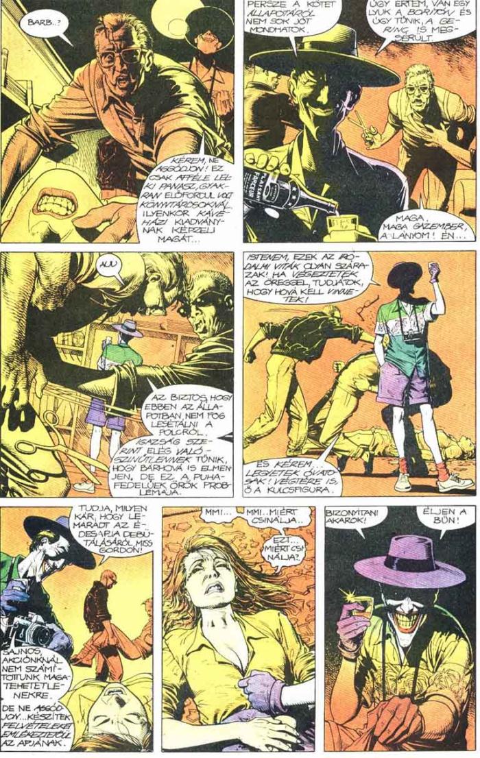 Hihetetlen érzékenység… amit Moore a történet elmesélése után azonnal elmaszatol. „Nem vagyok benne egész biztos, hogy mi volt az. Néha így emlékszem, néha úgy…” vallja be Joker, miközben arra a bizonyos napra utal. „Ha majd egyszer múltam lesz, jobb szeretném, ha több választási lehetőségem lenne.” Ezzel Moore felkínálja az olvasónak is a választási lehetőséget, így egyszerre mélyíti el a karaktert úgy, hogy közben nem vesz el semmit az őt övező misztikumból, ami pedig az eredettörténetek veszélye. Lesz, aki elfogadja ezt a változatot, míg más csak egy őrült hamis emlékeinek tudja be.