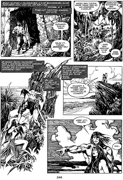 Persze, ezeket a történeteket lehet nagydózisban, egyszerre, de lehet szépen, beosztva is fogyasztani, talán az utóbbi inkább ajánlott. Mert annak is megvan a szépsége, amikor Conan a hétköznapi harcosok és viszolyogtató varázslók után egy valódi szörnyeteggel kerül szembe, ami lehet óriáspók, kardfogú tigris, pikkelyes barlanglakó vagy Béla, aki polippá lett. És a dinoszauruszok, ne hagyjuk ki a dinoszauruszokat, amiket az ötven évvel korábbi ponyváknak megfelelően rajzoltak meg, így a T-rex csoszog és húzza a farkát, és a növényevők is valójában csak