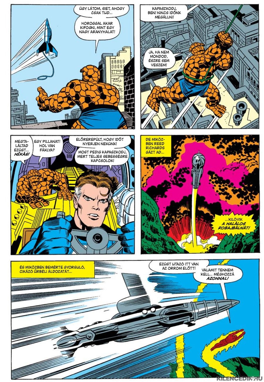 Üdvözlünk titeket újra a Fantasztikus Négyes csodálatos világában, ahol ezúttal Galactus és Ezüst Utazó keseríti meg hőseink életét! Képregényünk lapjain mikrokozmoszok, emberi léptékkel felfoghatatlan erők, a világ sorsáért folytatott összecsapások és megannyi hajmeresztő fordulat vár rátok, melyek a karrierje csúcsán lévő Jack Kirby művészi rajzain keresztül elevenednek meg.