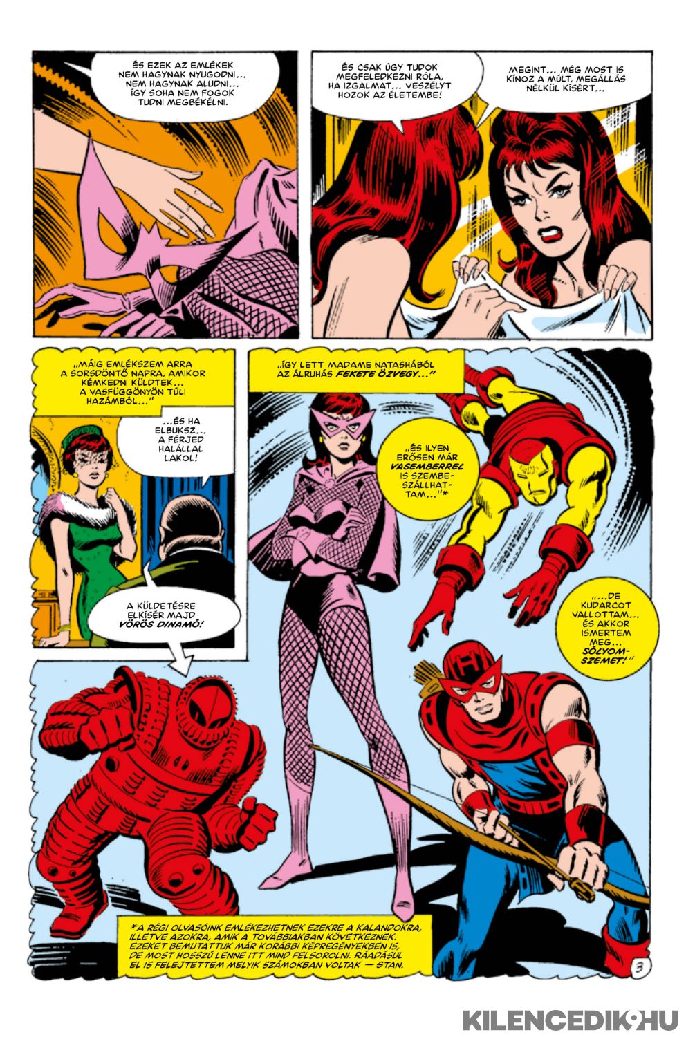 A szokásunkhoz híven ezt a kötetet is a címszereplő legelső megjelenésének bemutatásával kezdjük, vagyis a Tales of Suspense 52. számát olvashatjátok, amiben az Özvegyet elküldik, hogy kutassa fel az áruló Vörös Dinamót. Bár itt még nem hordja a ma ismert jelmezét, Natasha már itt is maga a megtestesült stílus, kimért személyiségével pedig nagyon is illik az orosz kém szerepére. Az első megjelenését követően a Fekete Özvegy más Invincible Iron Man és Avengers számokban is feltűnt, majd Sólyomszemmel is egy párost alkottak (sőt, amiatt a kapcsolat miatt volt kénytelen végleg nyugatra disszidálni).
