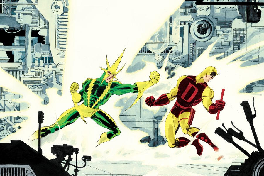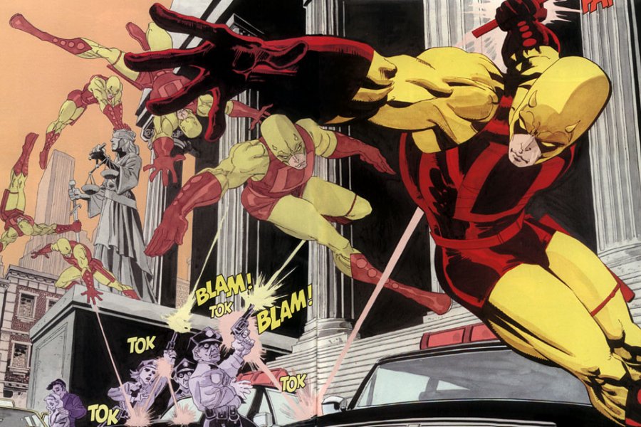 Fú Tim, tényleg látnod kéne a magyar kiadást. Ha eljössz VIECC-re, majd kiviszem, megmutatom. Emlékszel, a hatodik füzetben van az a csodás kétoldalas, mikor a Killgrave irányított zsaruk közt Fenegyerek bal középről átakrobatáskodik a jobb lapszélre, abba a frankó beállásba? Na, az az előzék, egyszínű sárgában. Kinyitod, és egyből ott is ragadsz. Király. De kiemelhették volna gyakorlatilag bármelyiket ezek közül a mozgásfázisokkal folytonossá tett dinamikus kétoldalasok közül, mindegyik nyerő választás. Amúgy is mindig leragadok egy-egy akciójelenetednél, de így nagyban aztán jó sokat lehet nézegetni. Tudom, nem mindenki szereti a stílusod, főleg az arcaiddal barátkoznak meg nehezen, én mégis úgy gondolom, hogy remekül visszaadják a karakterek érzelmeit. Matt színezésével együtt olyan szépen összefonódik a képi világ és a narratíva, hogy majdnem ez a kedvenc történetem tőletek.