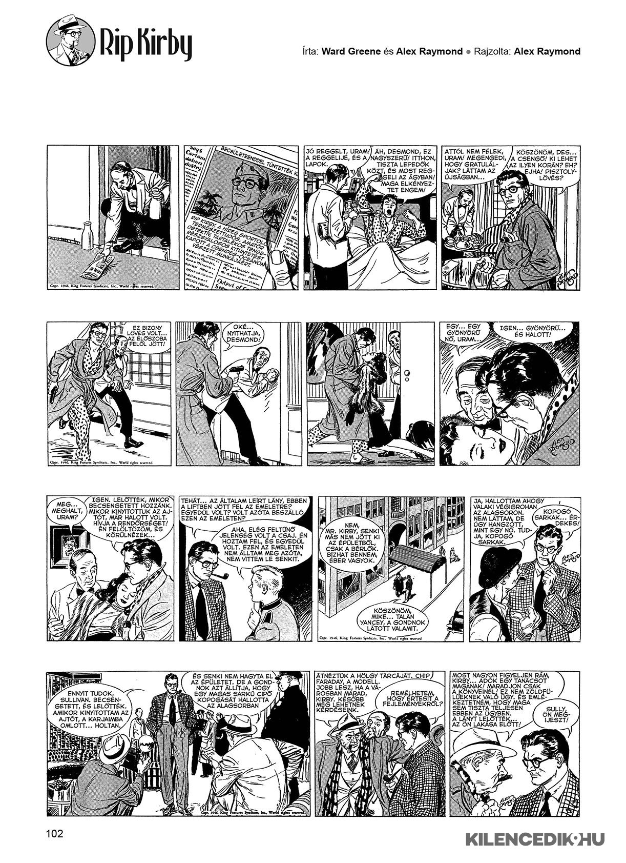 Elérkeztünk a fagyikehely tetejére finoman odahelyezett cseresznyéhez: a Rip Kirby strip még akkor is megvetetné velem a magazint, ha csak egyetlen csík kapna benne helyet lapszámonként. Ennek elsődleges oka a csodálatos Alex Raymond. Teljesen mindegy, hogy sci-fi, dzsungelkaland vagy realista detektív stripet rajzolt, olyan káprázatos eleganciával és kidolgozottsággal tette, ami magasan kiemelte a kor rajzolói közül. A Rip Kirby azonban nem csak ettől különleges: a ponyvák magánnyomozóitól eltérően hősünk nem egy csajozó szeszkazán és nem ugrik fejest a balhéba. Ehelyett okos és megfontolt, több időt tölt a nyomozással, mint ökölharccal vagy lövöldözéssel. Az esetei életszerűek és valódi emberi sorsokról szólnak. Igazán kiváló és egyedi strip, ami 1946-tól egészen 1999-ig futott, míg végül Rip nyugdíjba nem vonult – ugyanis a stripek többségével ellentétben itt öregedtek a szereplők az idő múlásával. Egy teljes ügy került bele a magazinba és a következőben váltja Corrigan, de nagyon remélem, hogy viszontlátjuk még.