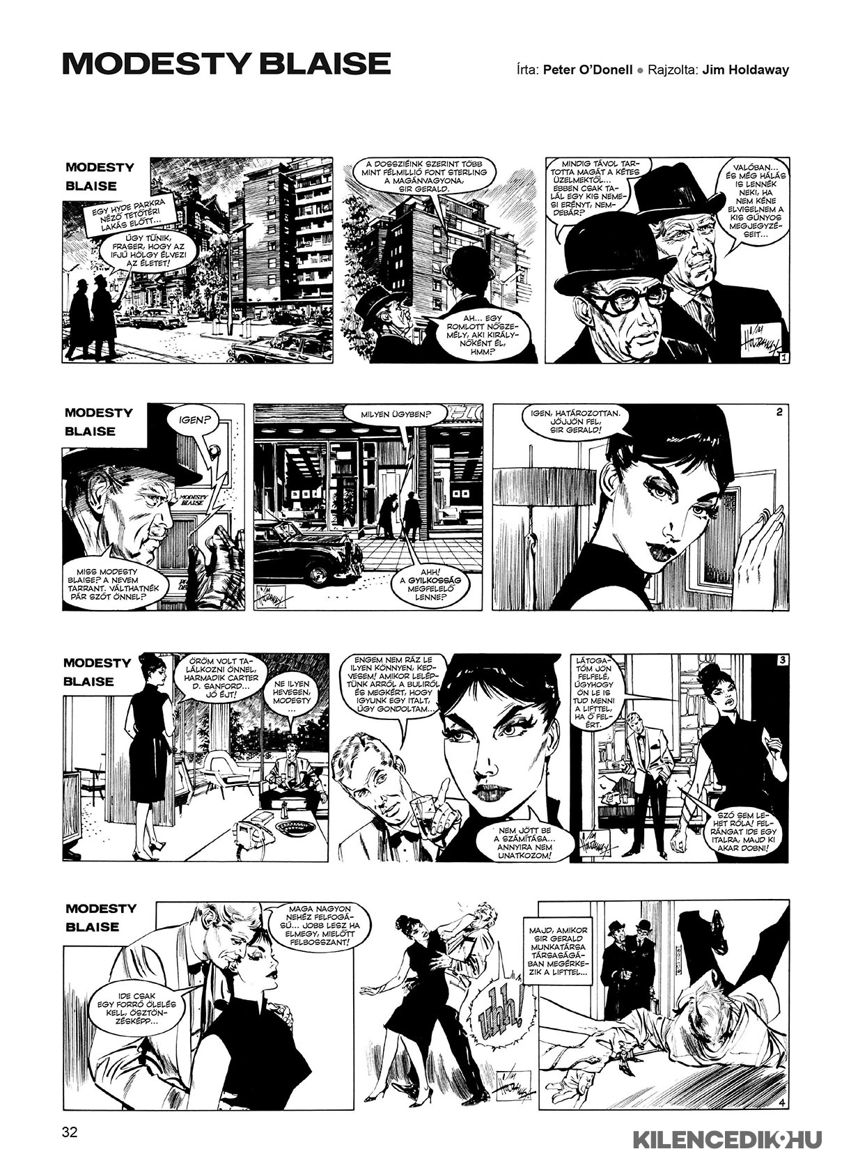 A következő 29+3 oldal a címlaplányé: Peter O’Donnell és Jim Holdaway kiváló krimi/kém-thrillerének, a Modesty Blaise-nek kapásból az első 114 stripjét kapjuk meg a La Machine történettel. Túl azon, hogy ez is egy képregénytörténeti klasszikus, kicsit meglepő, hogy mennyire élvezetes, pedig több, mint ötven éves stripről van szó. Mondjuk, James Bondból is a Sean Connery filmek voltak a legjobb, ugyebár. Apropó, James Bond: az extra három oldalnyi Kezdetben részben már ismerős lehet a rövid életű James Bond képregénymagazin olvasói számára, ugyanis a harmadik füzetében megjelent az eredeti strip „hagyományos” képregényre átszabott változata, de az eredeti változatot most olvashatjuk először.