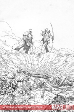 Wolverine 67: Az Old Man Logan második része. Annak a kontinuitásba nem számító mininek a második része, amit valami nehezen felfogható megfontolásból a szerkesztők a karakter fősorozatába passzíroztak bele. Nade sebaj. Mark Millar egy újabb részt szentel a felvezetésnek, mert ha jól látom, a cselekmény lényegi része majd csak a következő számban indul be: mentőakció Pókember unokájának, Sólyomszem lányának kiszabadítására. Addig is láthatunk mindenféle egymás után hajigált képeket a disztopikus jövő sivárságáról és kilátástalanságáról. Dühös, gonosz szellemlovasok, akik jól ronggyá verik a pacifista Logant, míg a vak Sólyomszem hallás alapján le nem nyilazza őket (micsoda meglepetés), egy roppant röhejes ugratás a pókmobillal egy marhanagy szakadék tetejéről (cool by Millar), és egy változatosság kedvéért igencsak hatásos panel az egykori Thor pörölyéről a beszédes nevű Hammer Fallsnál (és egész jó ötlet a városokat földbe süllyesztő lények, a Föld „immunrendszere is” – csak remélni merem, hogy szerepük is lesz a sztoriban, nem csak random érdekesség gyanánt vannak ott). Röviden összefoglalva: lassan haladunk valami felé, ami egy kicsit sem tűnik eredetinek és bármilyen szempontból meglepőnek. Logan pacifizmusa pl. akkor volna csak igazán érdekes, ha megmaradna a sztori végéig, de erre persze esély sincs – így meg minek? Úgyis mindenki tudja, hogy előbb-utóbb (tippem szerint a következő rész végén) egy egészoldalas képen áll majd a vérrel borított karmaival. A sorozat mindeddig egyetlen igazi erőssége Steve McNiven, aki gyönyörű, komor hangulatú képekkel lehel életet Millar mérsékelten érdekes víziójába.