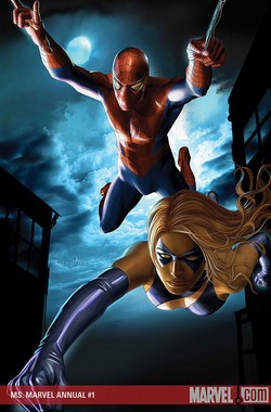 Ms. Marvel Annual 1: Brian Reed Pókembert ír, méghozzá (ld. a következő oldalakon) ebben a hónapban kétszer is. A Secret Invasion tie-inben nem sok sikerrel járt (bár abban igazából nem is szerepel Póki), itt viszont már jobban ráérzett a karakterhez szükséges hangulatra. Ms. Marvel és mindenki kedvenc hálószövője egymásba botlanak a városban, és előbbi rögtön rakná is a karperecet utóbbira, akinek ez nem különösebben van ínyére. Rövid bunyó után rájönnek, hogy egyesíteniük kell erejüket (naná), mert egy jókora robot tör-zúz a város utcáin (hisz a Marvel-féle New Yorkban vagyunk). Érdekes kis Annual ez, sok haszna és értelme nincs, már azonkívül, hogy Reednek alkalma van Pókembert írni – aki amúgy sokkal inkább főszereplő itt, mint a hígagyú szőkeség, akinek képregényében vendégszerepel. Egyébként a sztori olvasható, de nincs benne semmi különös. A várost fenyegető veszedelem kapcsán Reed viszonylag kreatív, a poénok tűrhetőek, az akció korrekt, Mark A. Robinson sokszor önmagukban humoros képei teljesen rendben vannak. Minden jó, de semmi nem annyira, hogy maradandó benyomást tegyen. Szóval ez egy mérsékelten érdekes képregény, amivel senki nem veszít sokat, ha kihagyja, de azt sem mondhatom, hogy bánni fogja, ha rászán tíz percet az elolvasására.