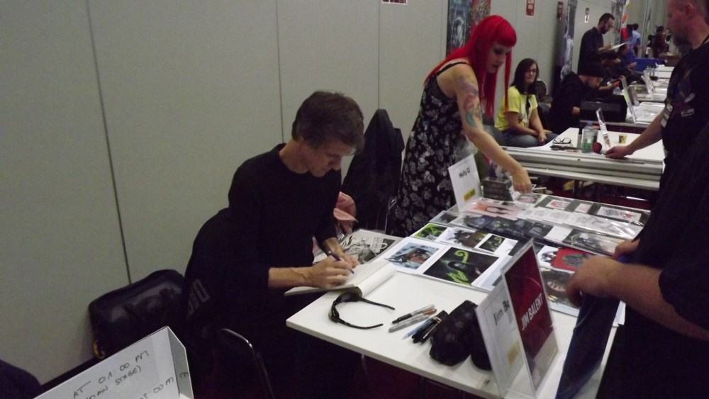 Számunkra a legizgalmasabb mindenképpen a képregényes sztárvendégekkel való találkozás volt. Az eddigi Con-ok közül ezen voltak a legtöbben. Kicsit furcsának tűnt, hogy messze nem keresték fel őket annyian, mint egy tévés hírességet, de legalább volt időnk elbeszélgetni kicsit mindenkivel. Adi Granov csak csendben, szerényen dedikált, rajzolgatott, de Snyder és Soule nagyon beszédes figurák – ez valami írói sajátosság lehet. A leghangulatosabb panel is hozzájuk köthető, ami igazán kellemes sztorizgatásokba kanyarodott el néha – amíg a moderátor közbe nem lépett. A legmenőbb viszont az abszolút kötetlen dumálgatás volt Chris Giarussoval – na meg a spéci dedikálás, amit kaptam tőle ?.
