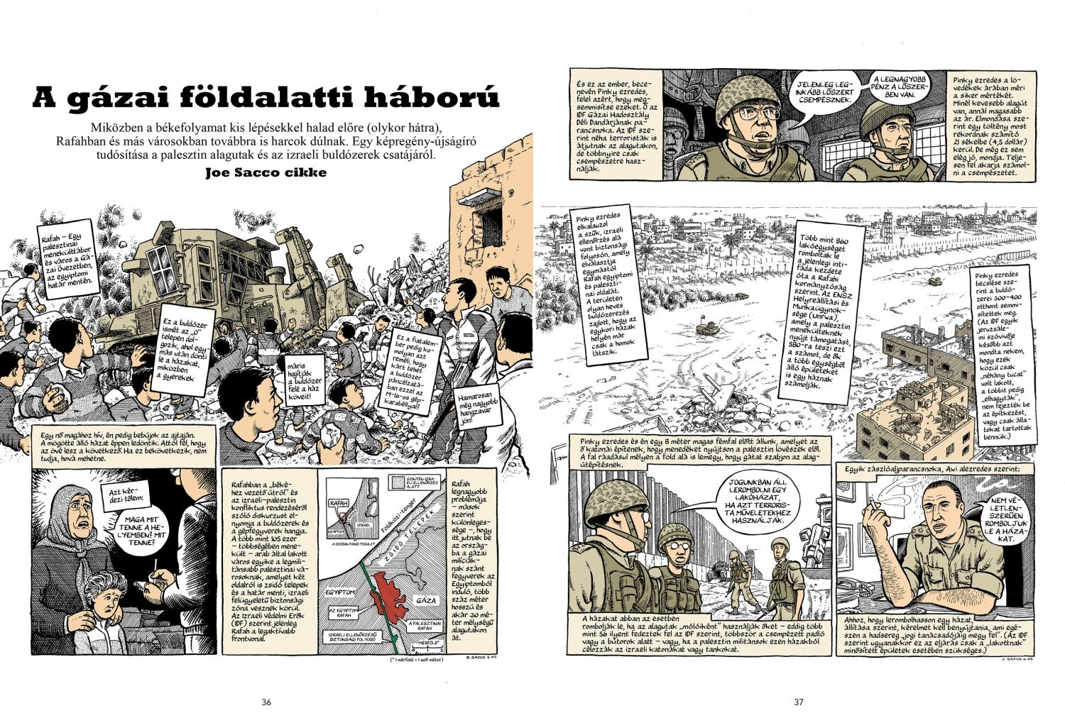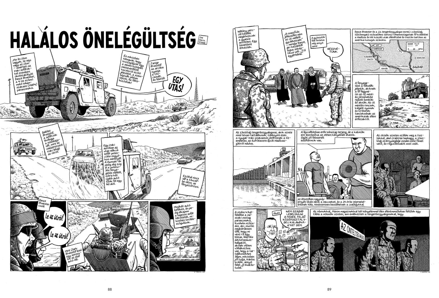 A világ legkiválóbb képregényes riportere újságírói munkáit gyűjtötte össze a Frontvonalban című kötetben, benne az Irakban szolgáló amerikai hadseregről szóló, az Egyesült Államokban soha nem publikált cikkekkel. Az elmúlt évtizedekben Joe Sacco – akit Christopher Hitchens korunk „erkölcsi rajzmesterének” nevezett – egyre inkább a rövid, rajzos újságírás felé fordult, hogy a világban dúló háborúk helyszíneiről tudósítson. Az itt olvasható, fekete humorral fűszerezett riportjai is igazolják, hogy Sacco napjaink egyik legjelentősebb haditudósítója.