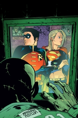 A konkurencia Adventures-részlegének említése azért is helyénvaló, mert akárcsak ott, a Superman/Batman oldalain is elsősorban a gyerek- vagy fiatalabb olvasók jelentik az elsődleges célközönséget. Persze mindkét kiadónál problémás ez a korcsoportok szerinti elkülönítés: a Marvel főuniverzumos Hulkja pl. abszolút kissrácokra lett kitalálva, jelen képregény pedig jócskán tartalmaz korhatáros részleteket is. Az aktuális számban pont a címszereplők azok, akik alig tűnnek fel: segítőik, Supergirl és Robin hősködnek együtt a legszebb team-up hagyományoknak megfelelően. Egy arkhami lázadást rendeznek le közösen (a Két Nagynak JLA-melója akadt), erről sztorizgatnak egy későbbi találkozásukkor. Ez a keret igazából teljesen fölösleges, ez a sorozat úgyis kontinuitáson kívüli, tehát nyugodtan visszaugorhattak volna az írók Kara és Tim korai kalandjához, de hát ők tudják. Ha rosszmájú akarnék lenni, azt mondanám, nem jött ki a 24 oldal, de szerencsére nem vagyok. Nem indul jól a 62. szám, de aztán belelendülnek az alkotók: az arkhami elmebeteg-válogatott ezúttal sem okoz csalódást. Már Joker szakavatott operációs kísérleténél felcsillan a szemünk – a rajzoló, Rafael Albuquerque ráadásul őt különösen jól ábrázolja. A Kalapos megszokott teadélutánja is kellően őrültre lett véve. Kár, hogy a Green-Johnson duó a karakterkezelésben már nem jeleskedik ennyire: Tim és Kara között annyi a különbség, hogy a fiú mogorva kiscserkész, a lány pedig szeleburdi (imádom ezt a szót). Egy ilyen címben álmodni sem mertem volna erotikus vibrálásról, de némi jellemábrázolásba a legkisebbek sem halnának bele. A történet tehát sovány és csak hellyel-közzel szórakoztató, de a rajzok szerencsére emelik a színvonalat. Joker-rajzai miatt már dicsértem Albuquerque-t, aki egyenletesen jól teljesít ebben a számban: dinamikus, átlátható, kifejező rajzfilmes képeket kapunk, és az arkhami jelenetek megfelelően sötétre, árnyékosra sikeredtek – minden szempontból ezek az oldalak jelentik a füzet csúcspontját. Kár, hogy végeredményben a Superman/Batman júliusi száma még így is csak egy átlagos Tini Titánok-epizód nívóján marad.