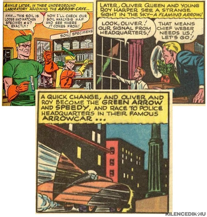 Oliver Queen, azaz a Zöld Íjász eredetileg egy elég nyilvánvaló Batman-másolat volt, egy milliomos playboy, aki álruhás bűnüldözőként titkos bázisáról, az Íjász-barlangból indult járőrözni az Íjászmobilon, amikor a város egén feltűnt az íjász-jel.