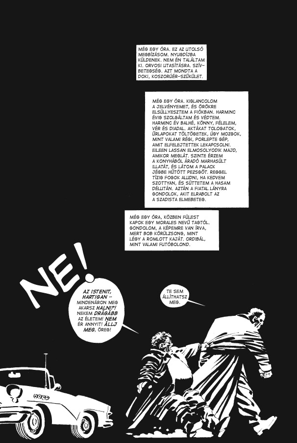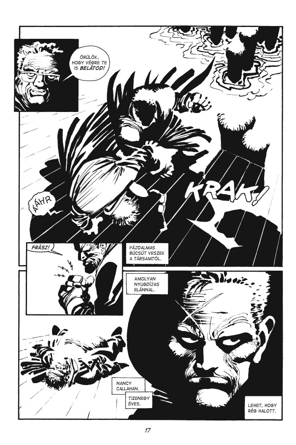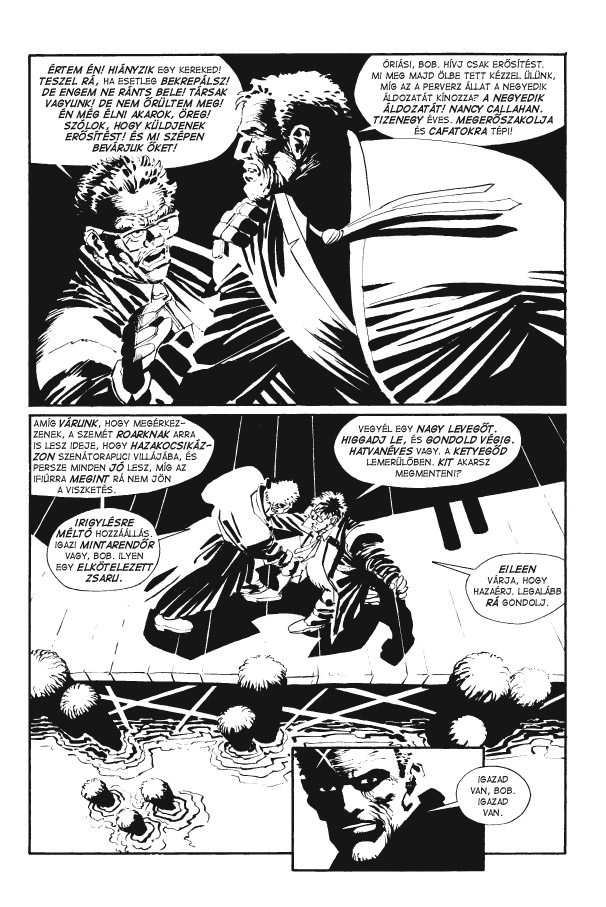 Végül essék szó a magyar kiadás sajátosságairól: Benes Attila fordítása Heltai Olga filmfordításán alapul, ami tiszteletre méltó gesztus, különösen annak fényében, hogy a másik oldalról bizonyos képregényfilmek fordítói nemes egyszerűséggel sz*rnak a meghonosodott, ismertté és népszerűvé vált nevekre, szövegekre (naná, hogy ROZSOMÁKra gondolok!!). Külön öröm a külcsínben, hogy a harmadik kötet gyatra újrahasznosítottja után ezt ismét ragyogó, hófehér papírosra nyomták, így az előzőhöz képest az élvezeti érték itt nem csökken. Ráadásként megkapjuk az eredeti minisorozat borítóit (akkori felesége, Lynn Varley hangulatilag tökéletesen passzoló színezésével), továbbá egy képgalériát, amiben más művészek bizonyítják, hogy Sin City Miller egyszemélyes játszótere.