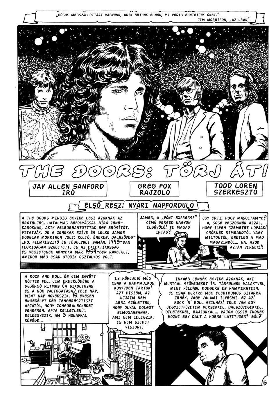 Mit is lehetne mondani a The Doors-ról? Legenda? Úttörő? Lázadó? Bármit, de tény, hogy a ’60-as évek egyik legmeghatározóbb zenekara volt, újszerű dalaikkal, előadásaikkal, koncertjeikkel lehengereltek mindenkit. Ez a képregény Jim Morrison ifjú korától mutatja be, hogy alakult meg a zenekar, milyen nehézségeik és botrányaik voltak.